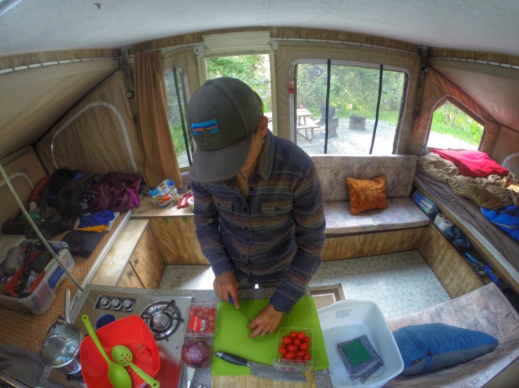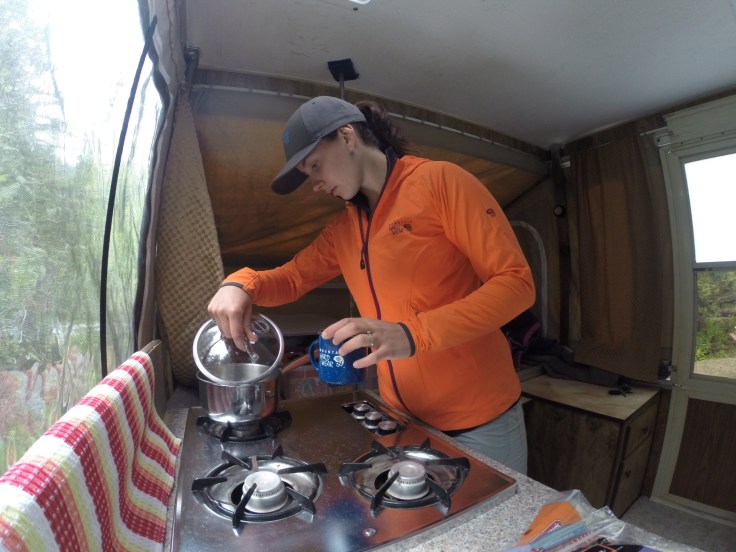Inside the tent trailer really feels like a palace. Lighting the old propane stove and heating water for tea while watching my little family rest is a beautiful thing.